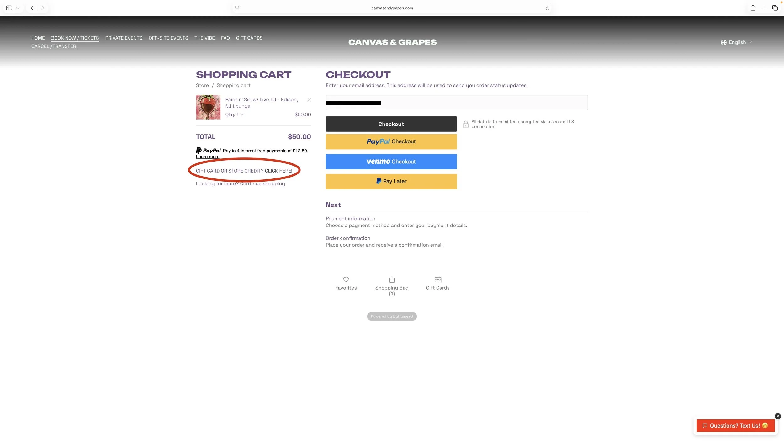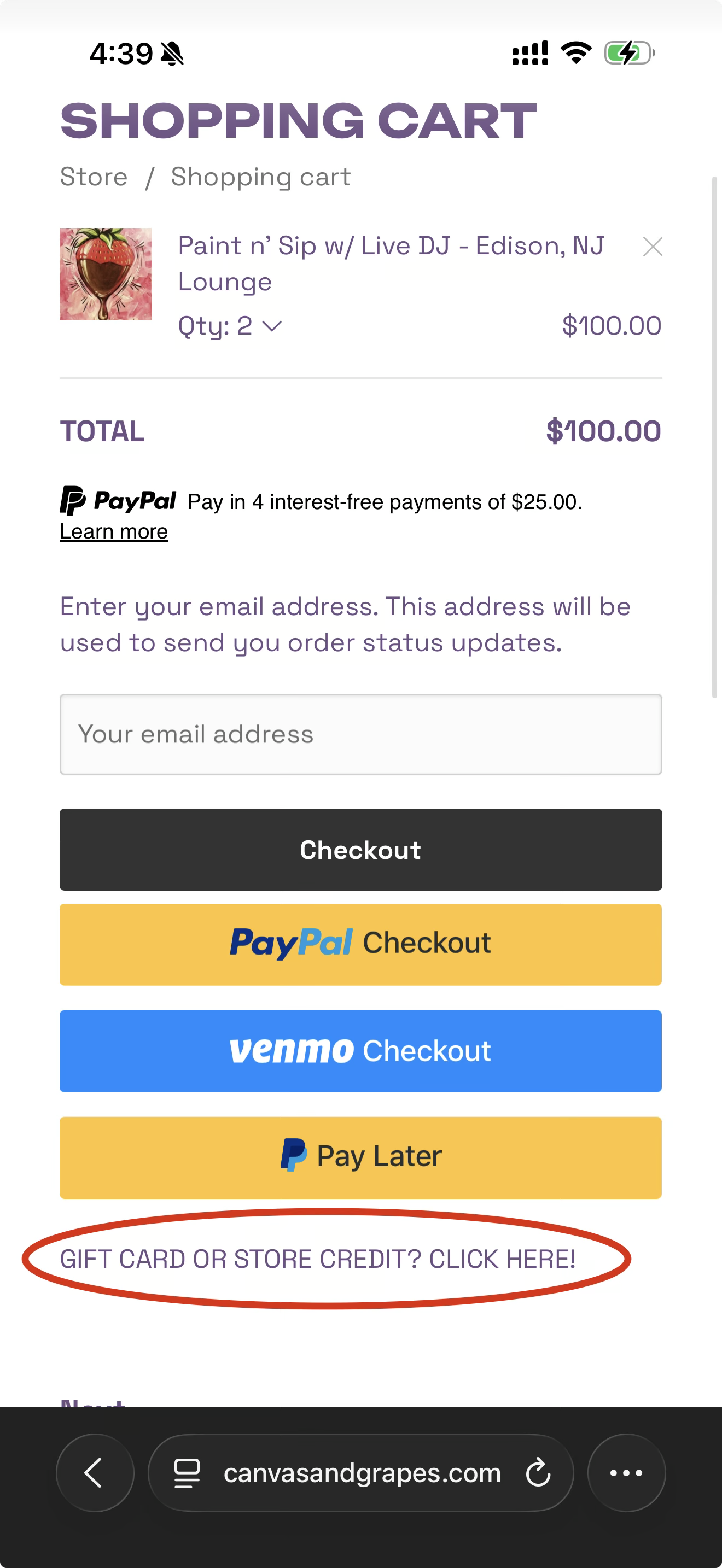 3. In the shopping cart look for the “GIFT CARD OR STORE CREDIT? CLICK HERE!” button located to the left or bottom of the chekout/paypal/venmo buttons (see example image below). DO NOT click “Checkout” until the credit is applied, or you will need to go back.